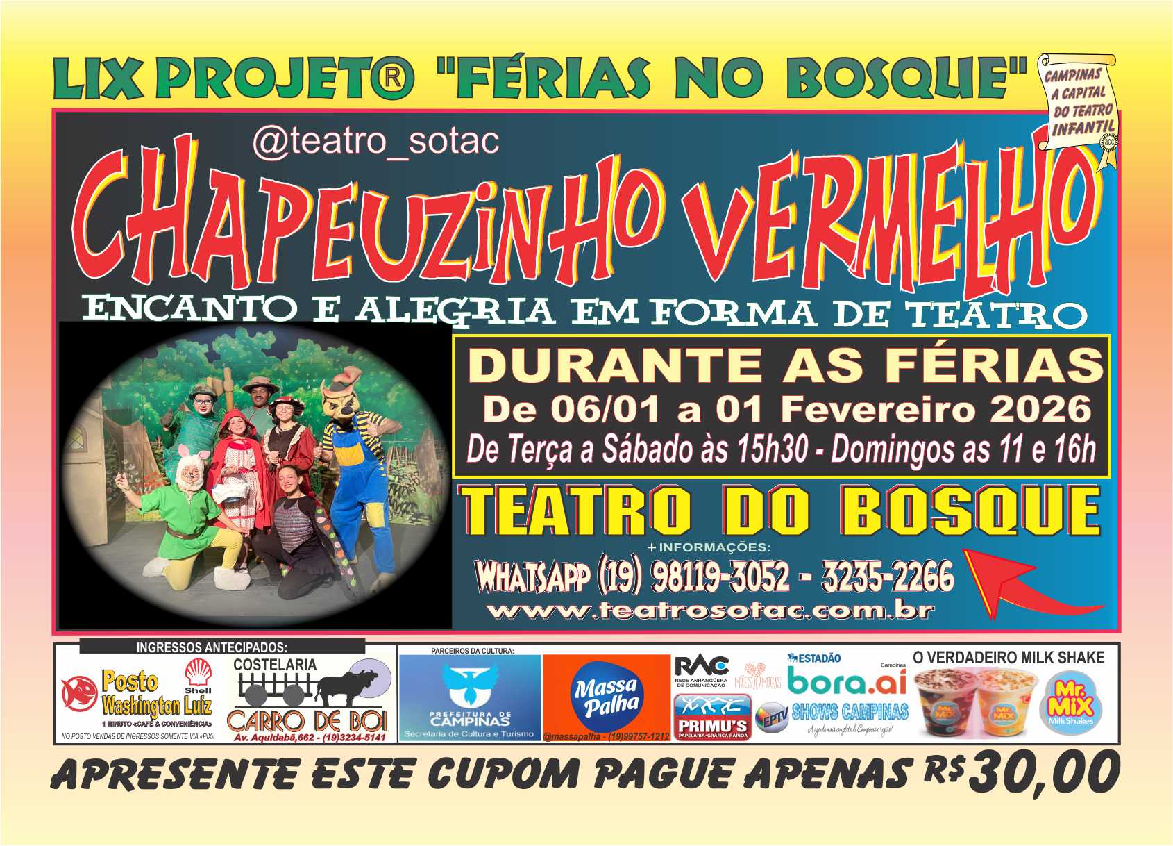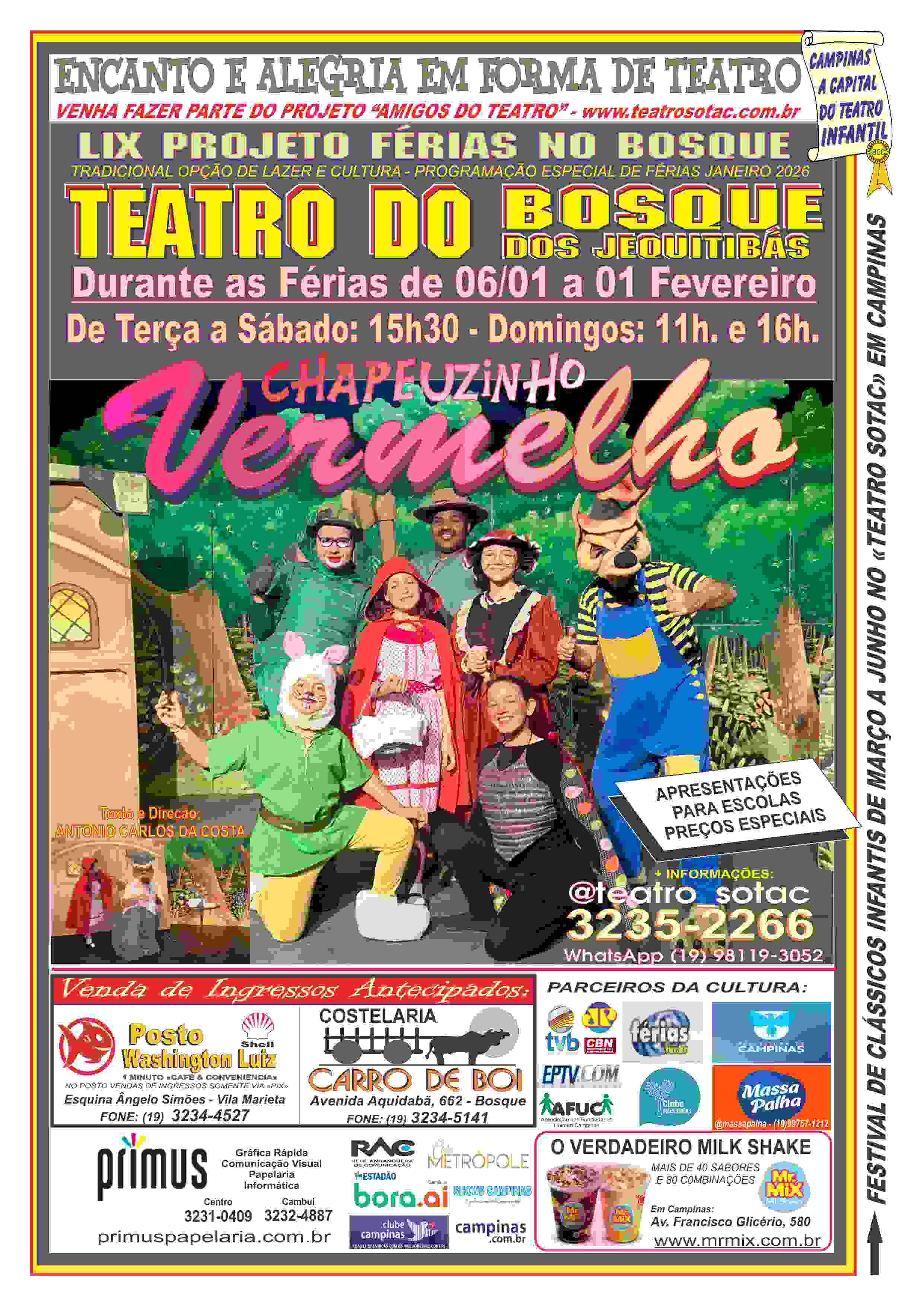 Para completar o passeio, será apresentado todos os dias, exceto as segundas-feiras, o espetáculo infantil – CHAPEUZINHO VERMELHO no Teatro Carlos Maia no Bosque dos Jequitibás, uma versão teatral com aquele toque de comicidade especial, característico da Cia. SOTAC, produções que conseguem agradar crianças e adultos numa atmosfera de magia e realidade.